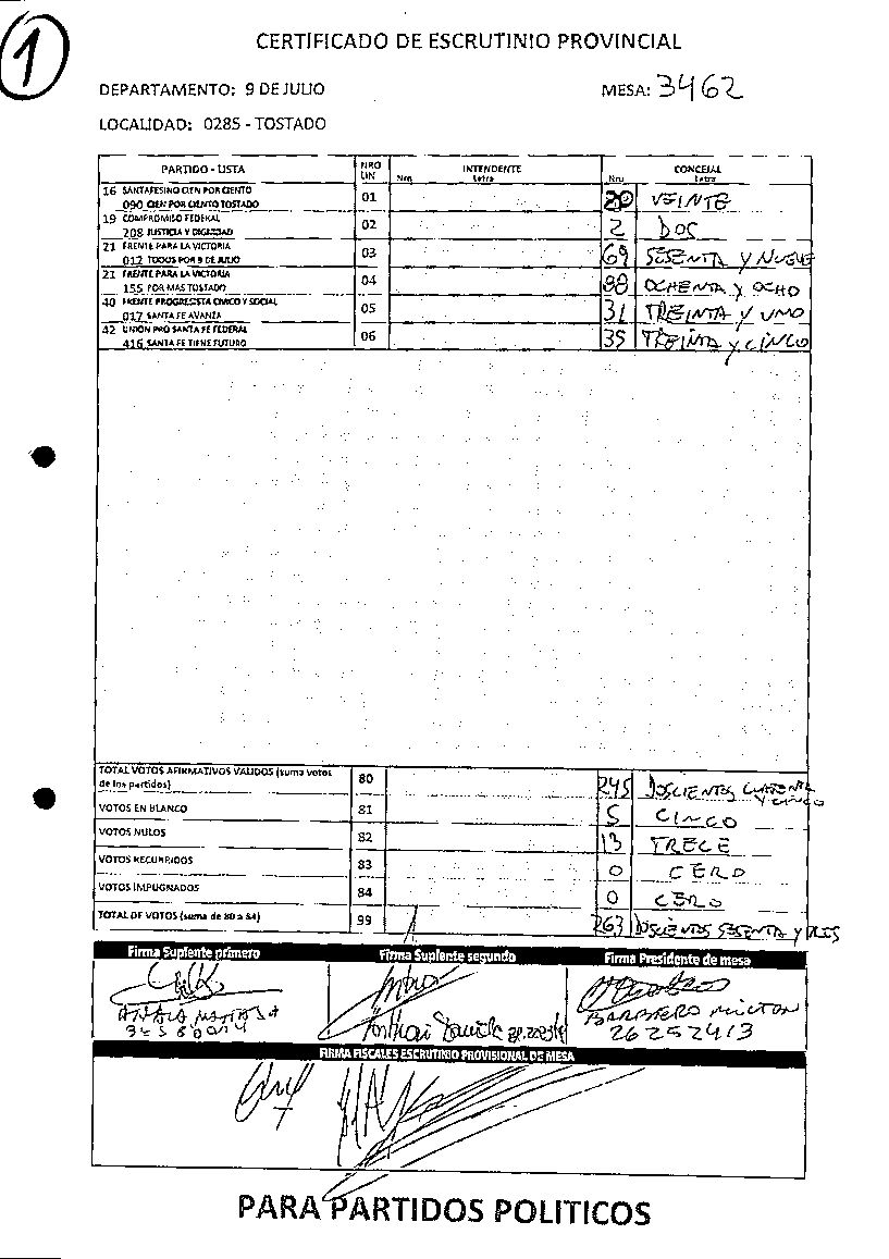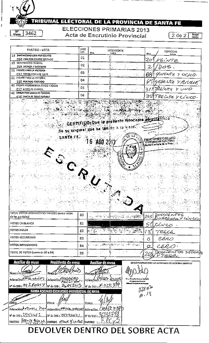 escrutarse en la ciudad de Santa Fe la mesa 3462, se adultera lo